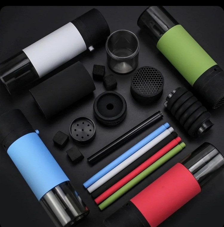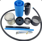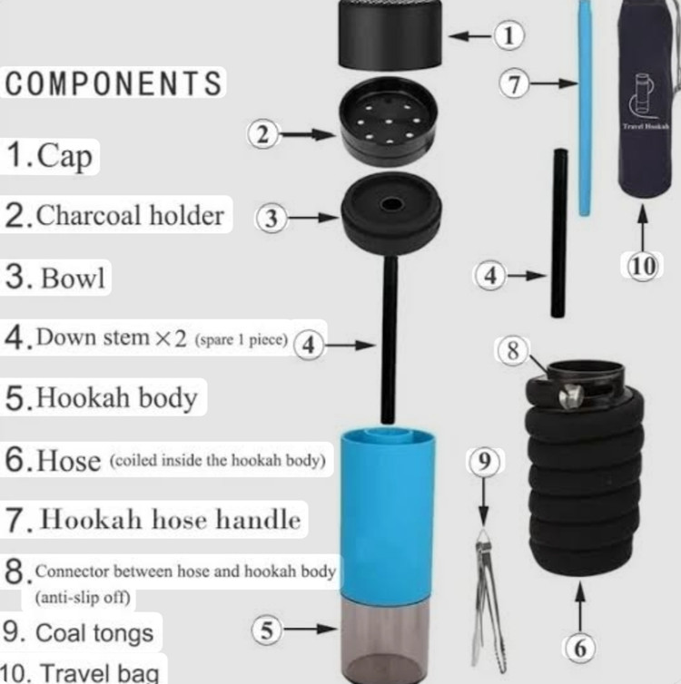ست قلیان مسافرتی شامل: آبپاش، شلنگ سیلیکونی،کاسه تنباکو، جا زغالی و انبر در رنگ مشکی، آبی ،قرمز و طوسی